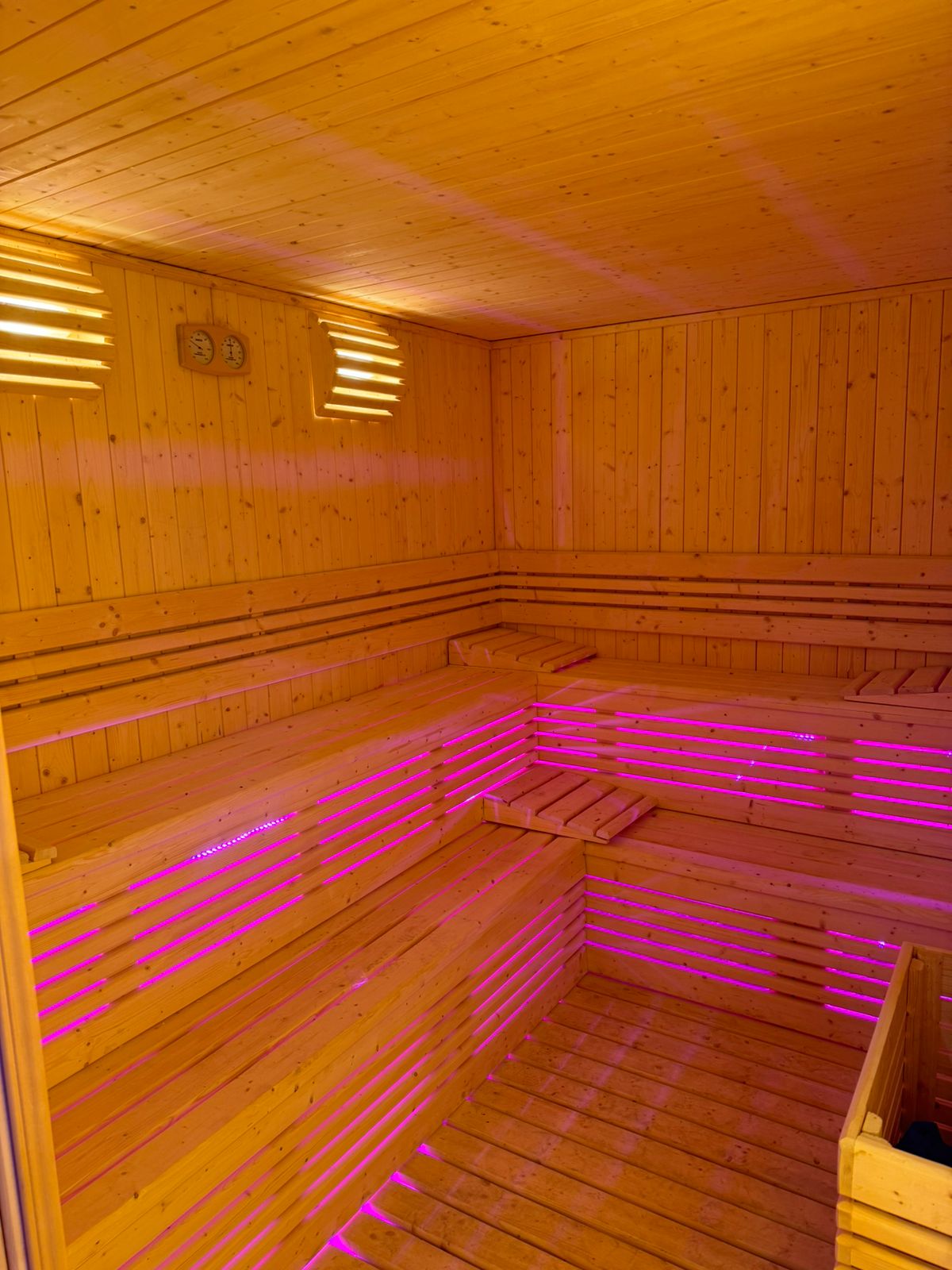 - المقاعد الخشبية داخل الساونا يجب أن تكون مصممة بطريقة مريحة وتتحمل درجات الحرارة العالية. يُفضل أن تكون متعددة المستويات، مما يسمح للمستخدمين باختيار مستوى الحرارة الذي يناسبهم.